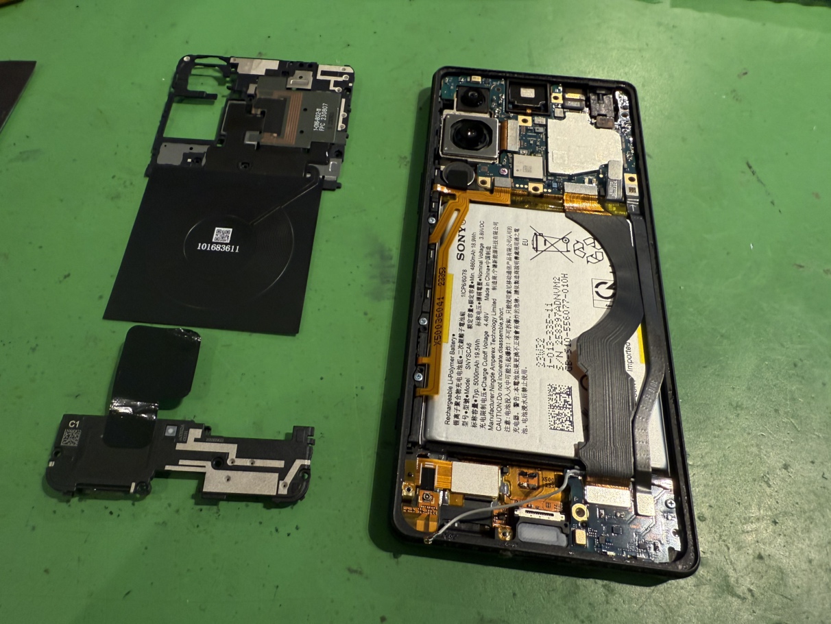 NFCやワイヤレス充電のコイル、ラウドスピーカーなどを取り外していきます。