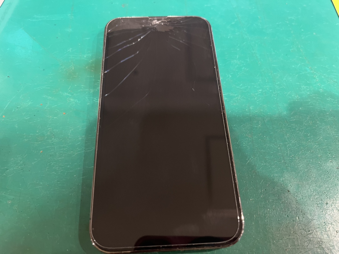 iPhone 13 Pro のフロントガラスにヒビが入り、表示は正常でもタッチ操作時に引っかかるとの症状でした。落下による軽度の破損で、内部液晶には影響が少なかったものの、このまま使用を続けると割れが広がり操作不能になる恐れがありました。