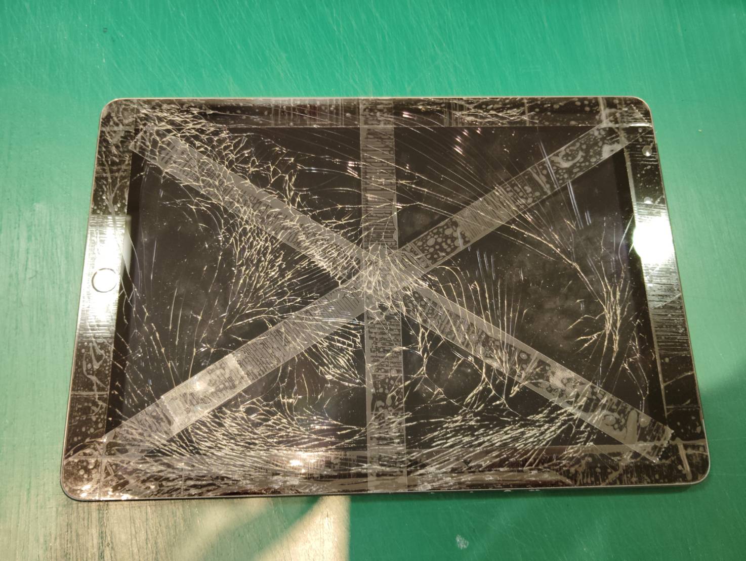 画面が粉々になってしまい、持ち運ぶだけでもガラスの破片がポロポロ落ちてくるような状態のiPad9です。