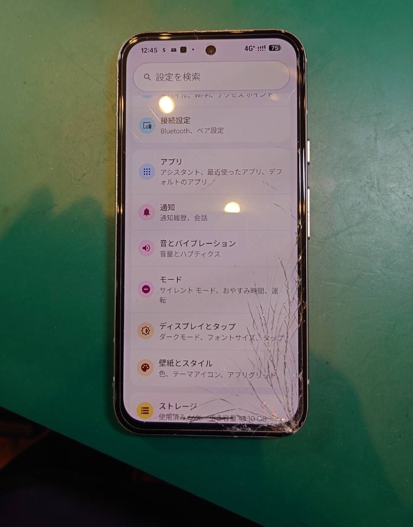 店頭で確認すると画面右下を中心として全体にひび割れが発生しており、左側の一部分でタッチが効かない不具合も発生している事が分かりました。