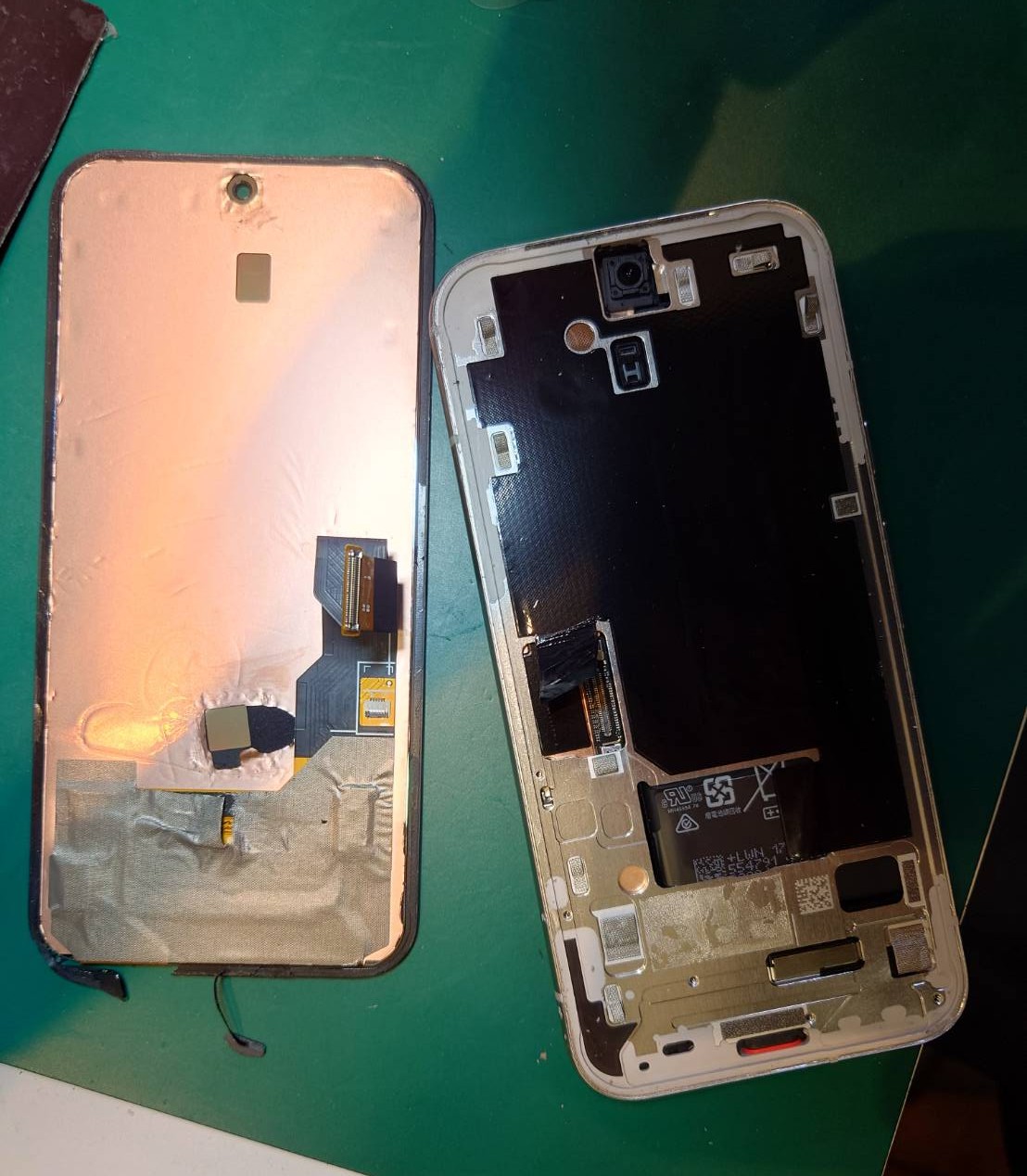 仮止め状態で明るさ調整やタッチを含めた正常動作を確認後、指紋センサー等を移植して新しいフロントパネルに交換を実施します。