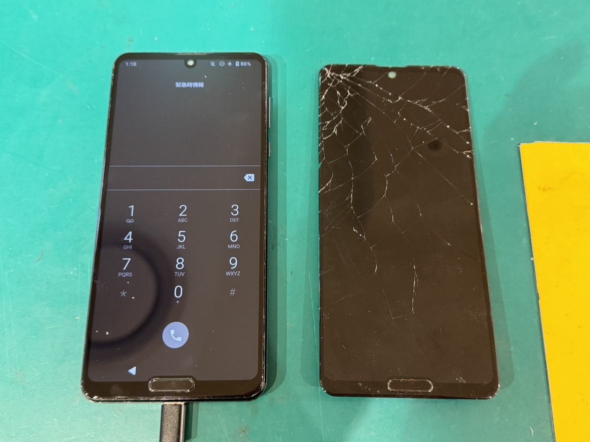 当店は総務省登録修理店として端末を丁寧に診断後、AQUOS R5G専用の液晶パネル(ガラス一体型)を交換しました。画面交換は内部コネクタとフレームの状態も確認し、動作確認を行っています。