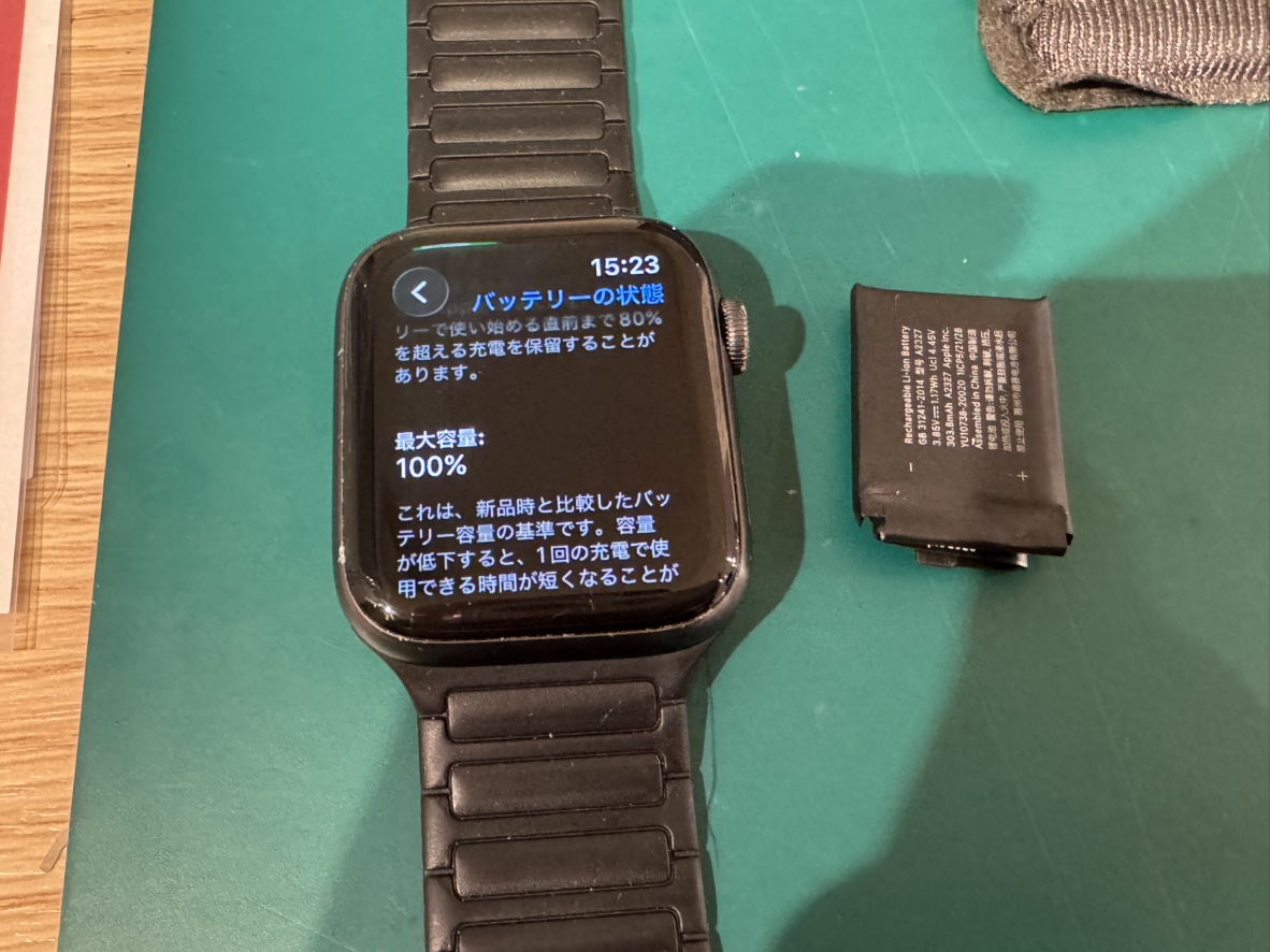 Apple Watch Series6(44mm)で、バッテリー劣化により持ち時間が急激に低下し、1日の途中で電源が落ちてしまう状態でした。劣化が進むとバッテリー膨張や筐体の破損につながるケースもあるため、早めの対処が安心です。