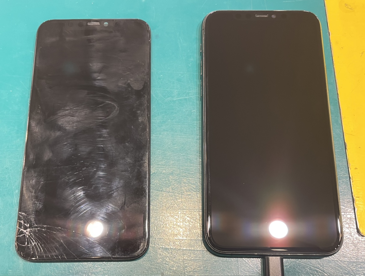 今回お預かりした iPhone 11 Pro は左下にひび割れがあり、液晶が一切映らない状態でした。