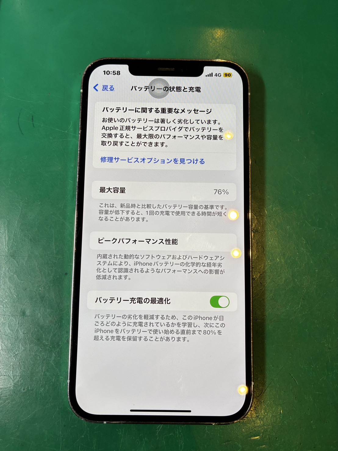 状態を確認してみると、最大容量が76%になっていました。最大容量が85%を切ってくると交換の目安となりますので是非ご確認ください。