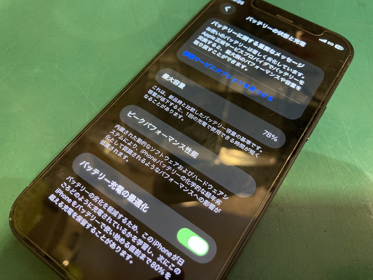 設定画面で確認したところ最大容量が78%まで低下していました。