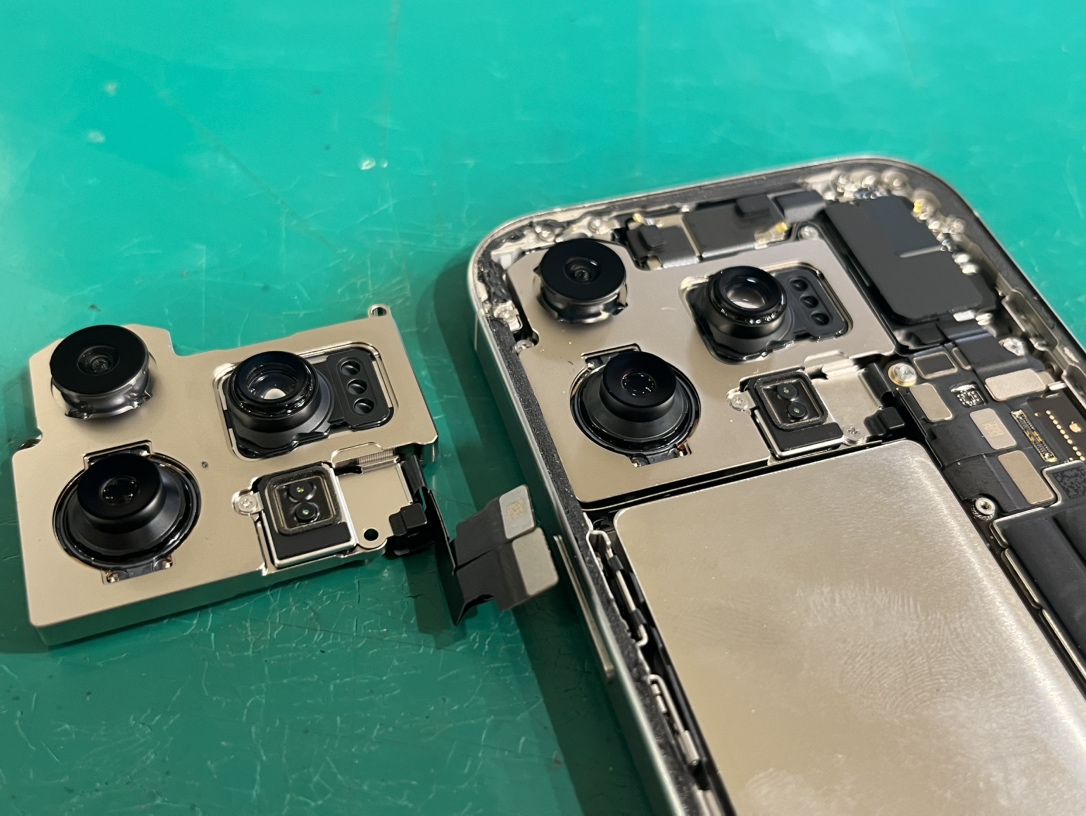 当店は総務省登録修理店として、安全基準に基づき分解とパーツ交換を行っています。今回は不具合の原因となっていたリアカメラユニットを取り外し、新しい高品質パーツへ交換しました。交換後は広角・望遠・AF・手ぶれ補正など各種センサーの動作を確認、問題なく撮影できる状態に復旧。