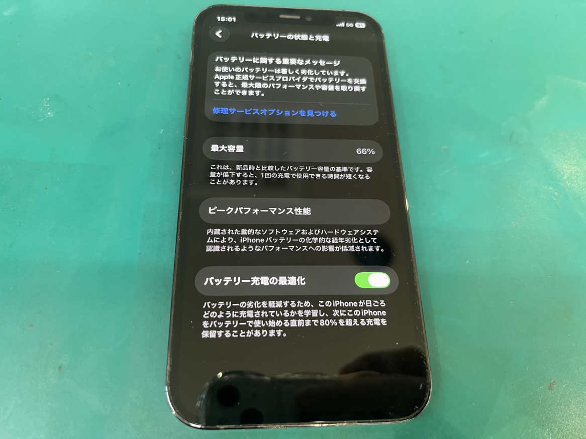 状態を確認したところバッテリーの最大容量が66%と表示されておりかなり電池が劣化している状況でした。