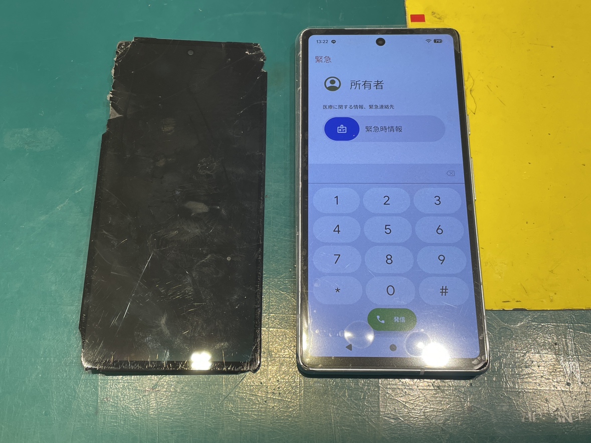 Pixel 7a を落下させたことでガラスが割れ、表示はされるもののタッチ操作に不具合が出ていました。放置するとヒビの拡大や表示不良、最悪の場合は操作不能に陥る可能性があります。