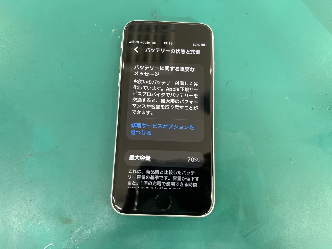 状態を確認したところ、バッテリーの最大容量が70%と表示されておりかなり劣化した状況でした。