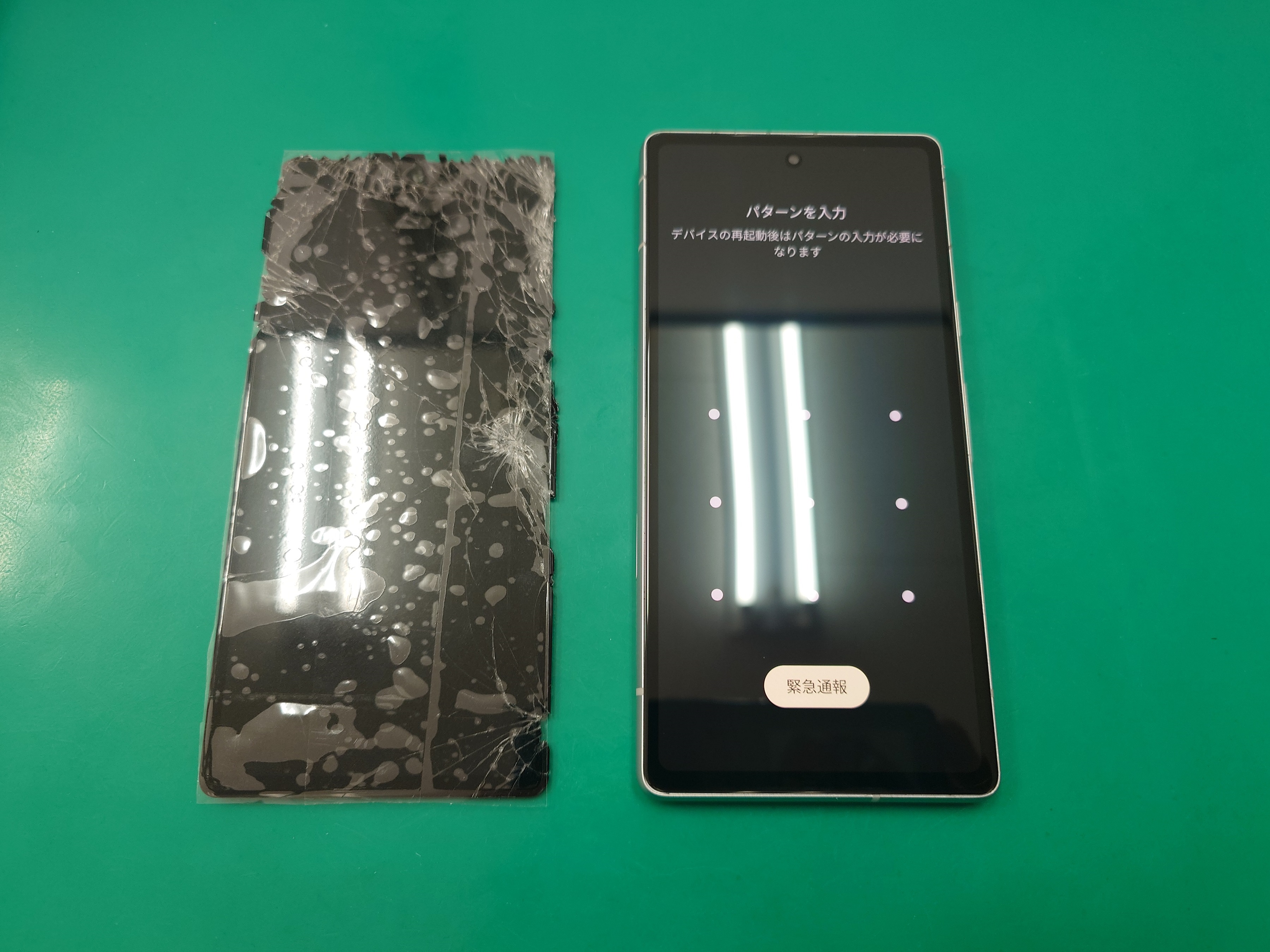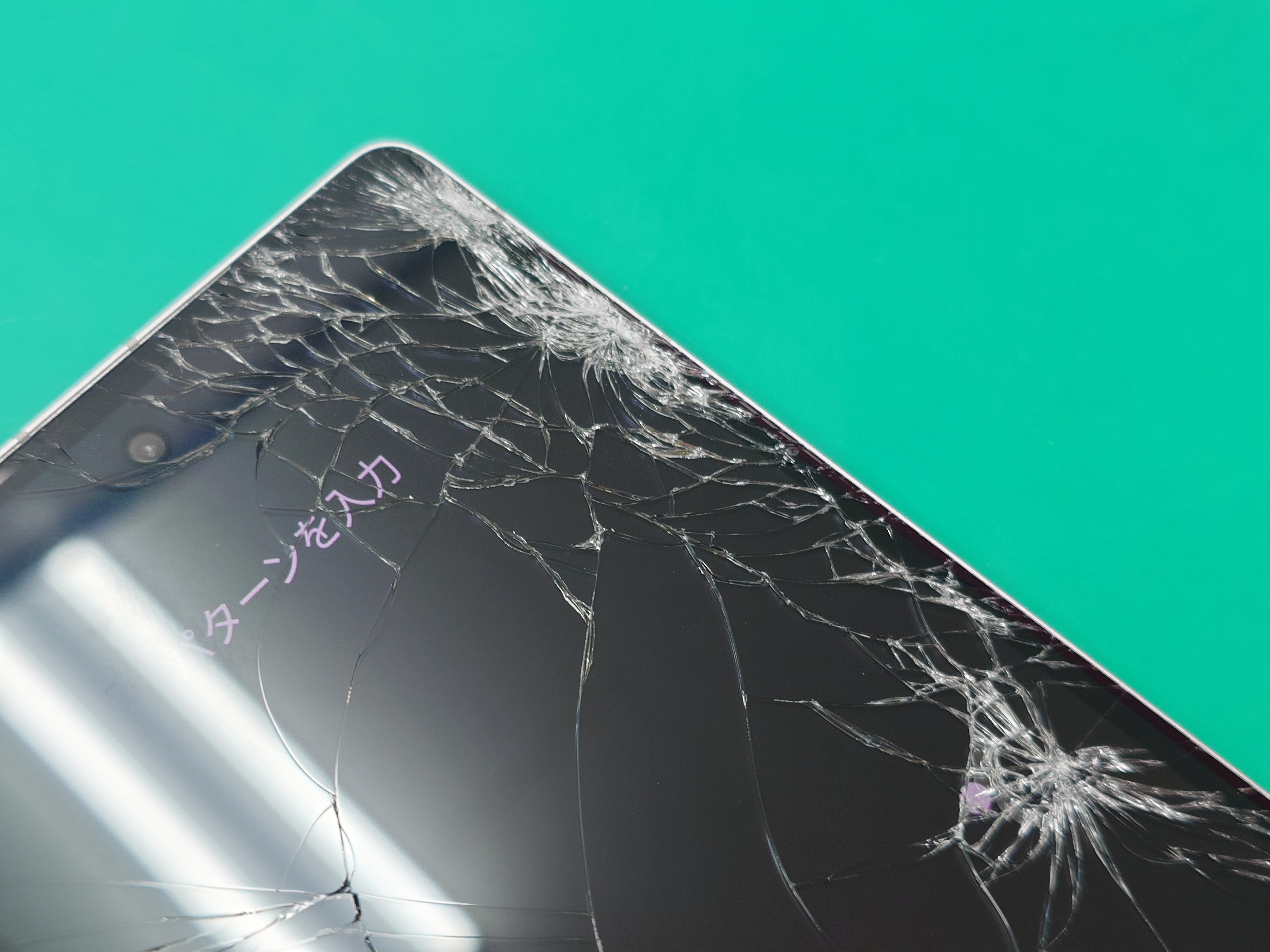 画面全体にヒビが入っており、特に右側が酷く割れていました😢