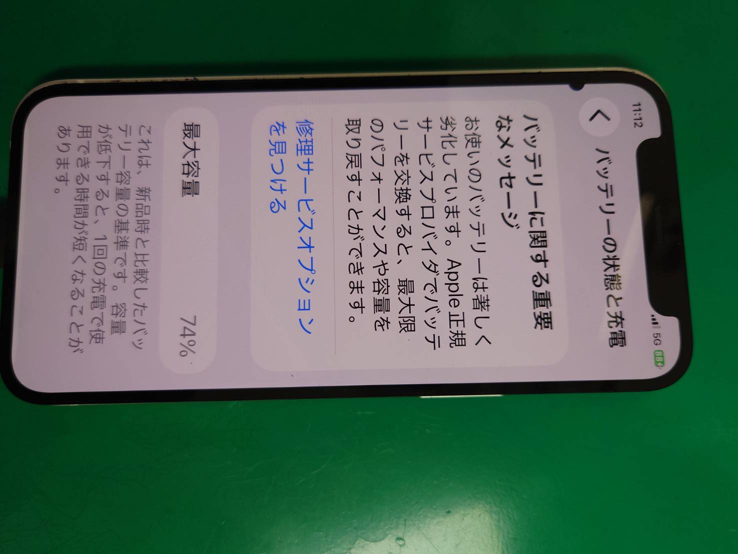 「バッテリーの状態と充電」上で「サービス」と表示がされており、バッテリー最大容量も74%。