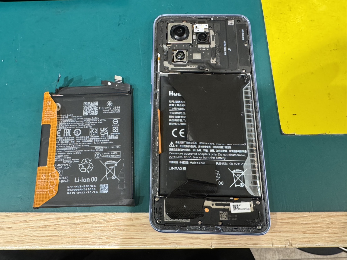 端末内部を丁寧に分解し、劣化したバッテリーを取り外しました。