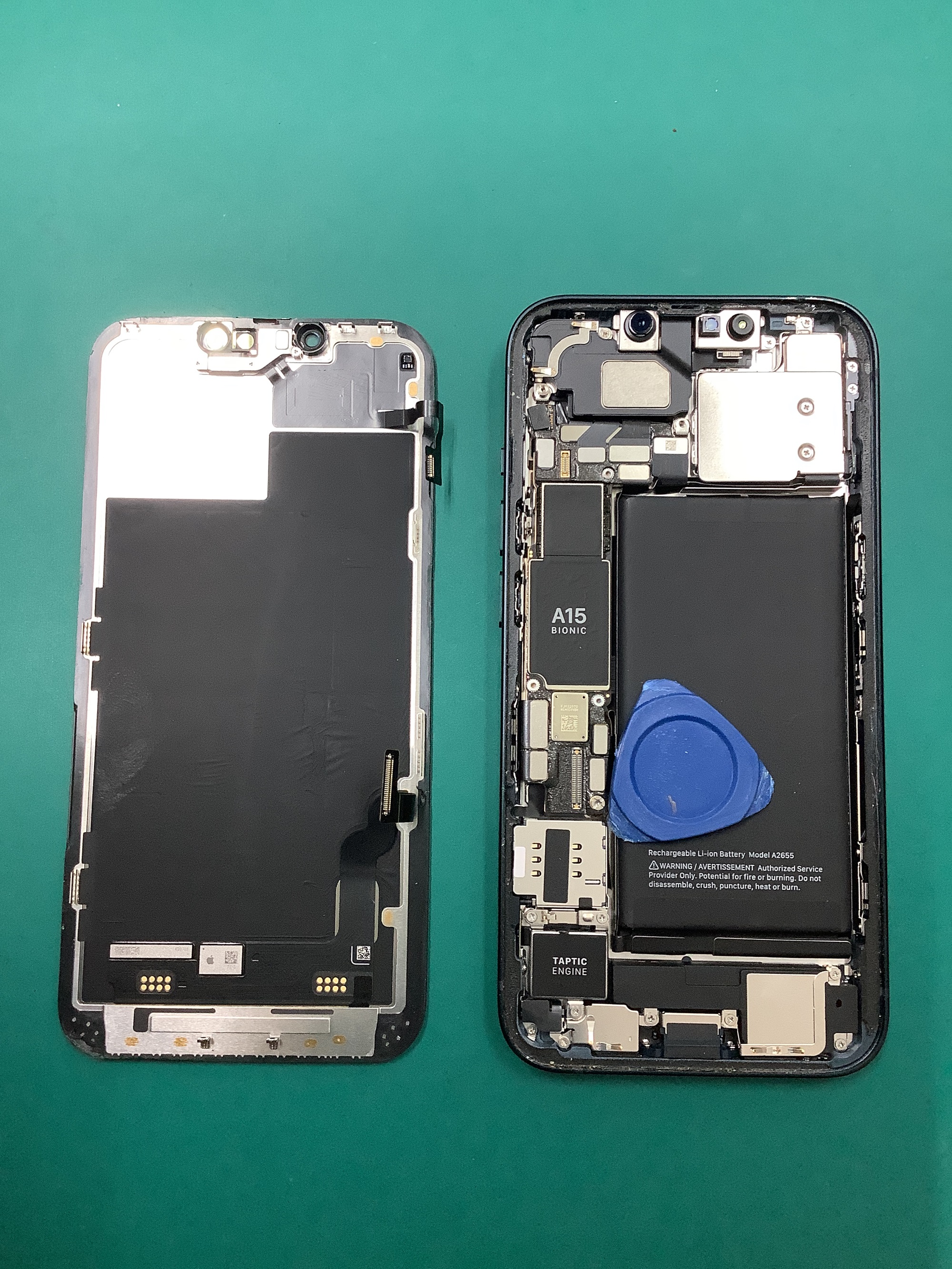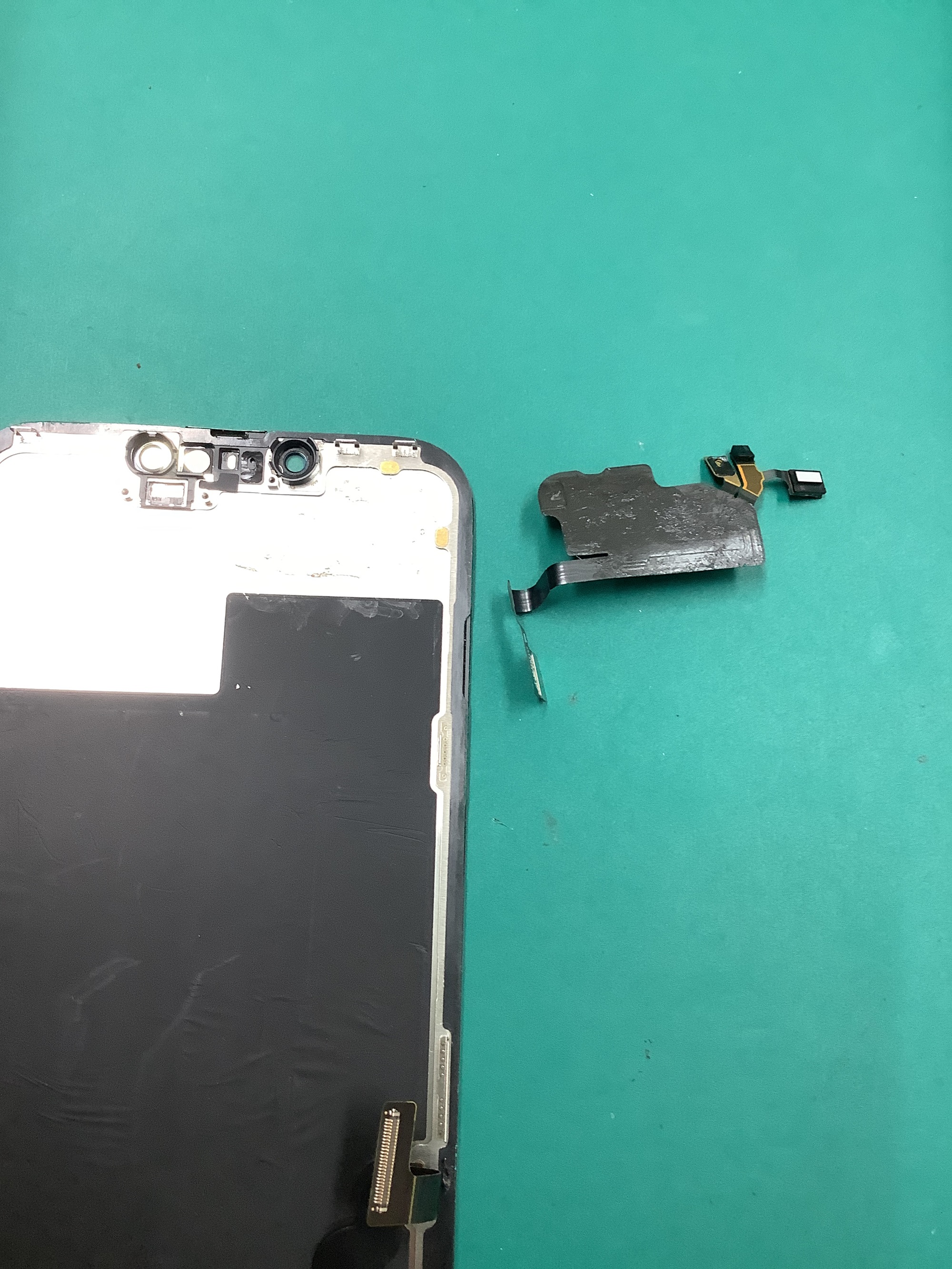 お次は外した画面に残ったままのフロントセンサー部分を外して、交換用の新しい画面へ移植していきます!