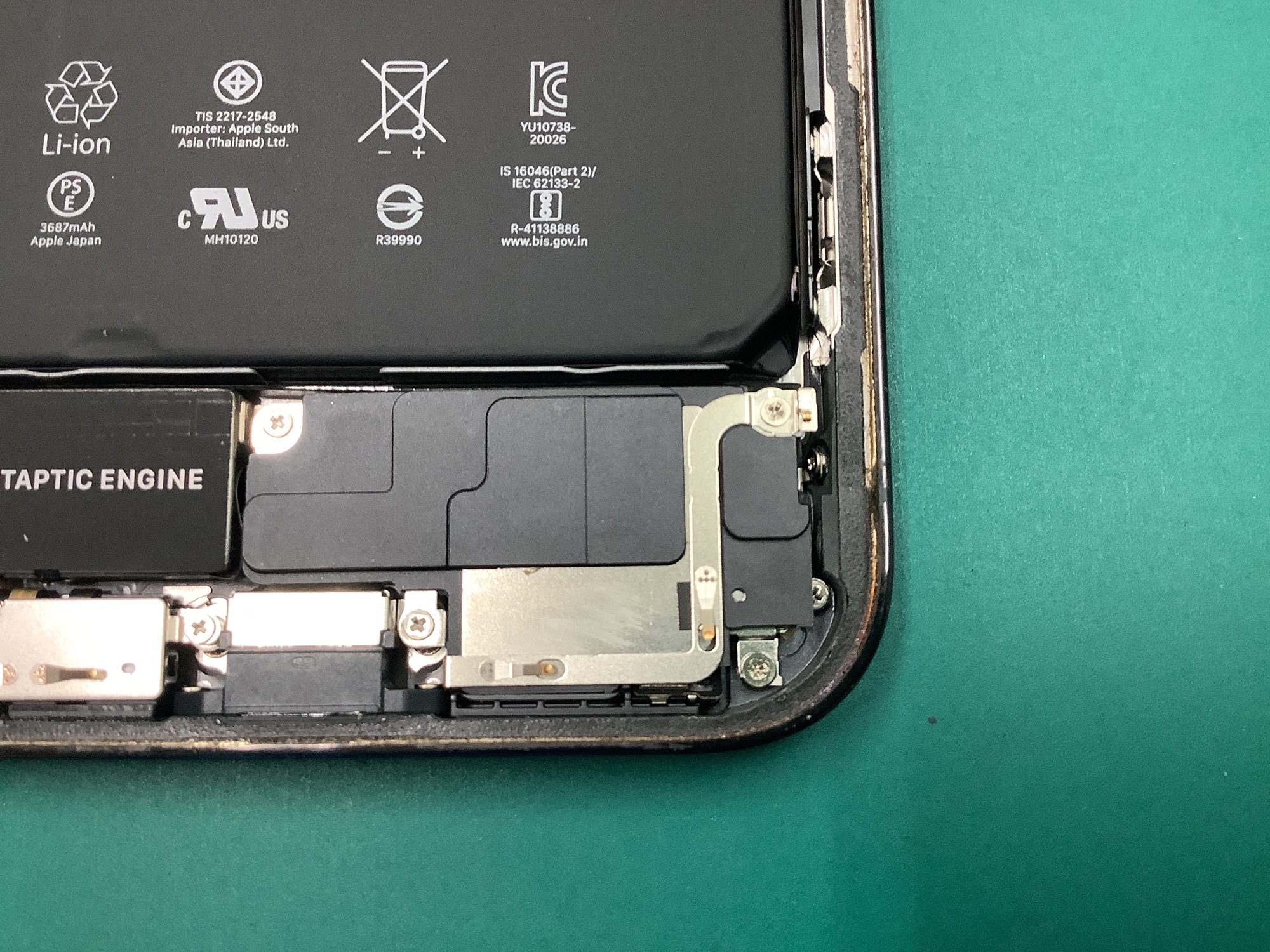 バッテリーが見えたので、早速バッテリーを外しに…といきたいところですが、バッテリー剥がす際の作業をしやすくするため、バッテリー下のスピーカー、タプティックエンジンを外してスペースを確保します!