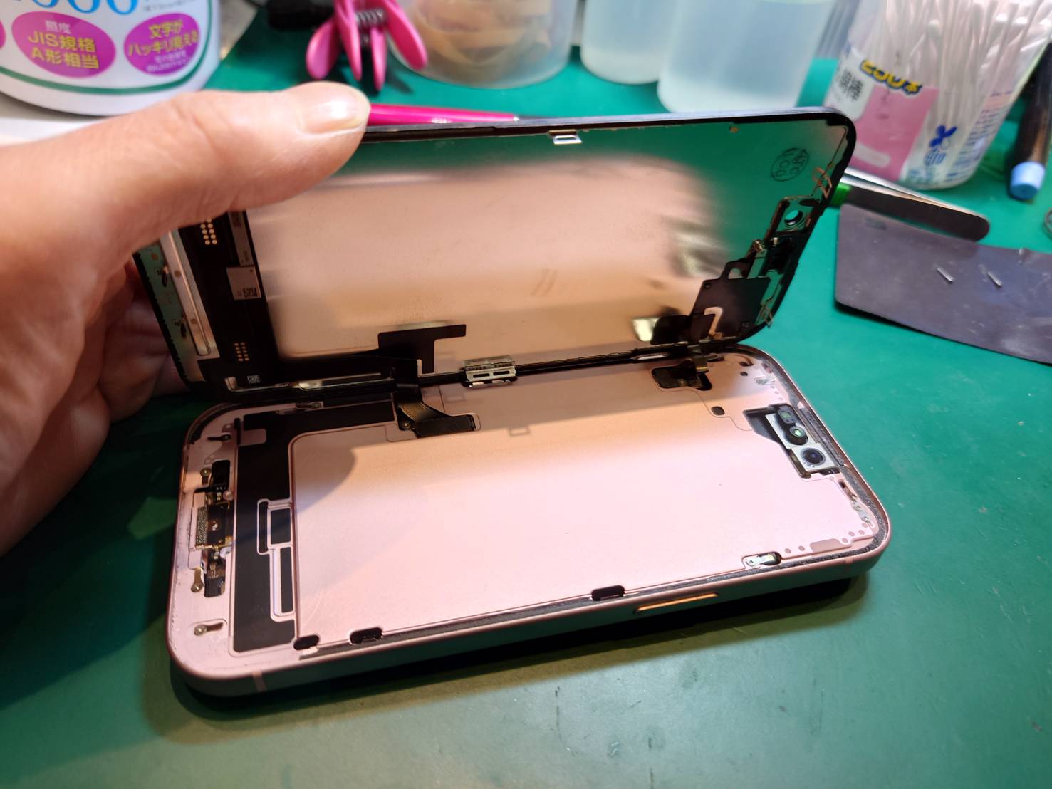 タッチが安定して出来る事/FaceIDが機能する事等各種正常動作を確認後、内部のクリーニングを実施し組み戻し作業完了です!!