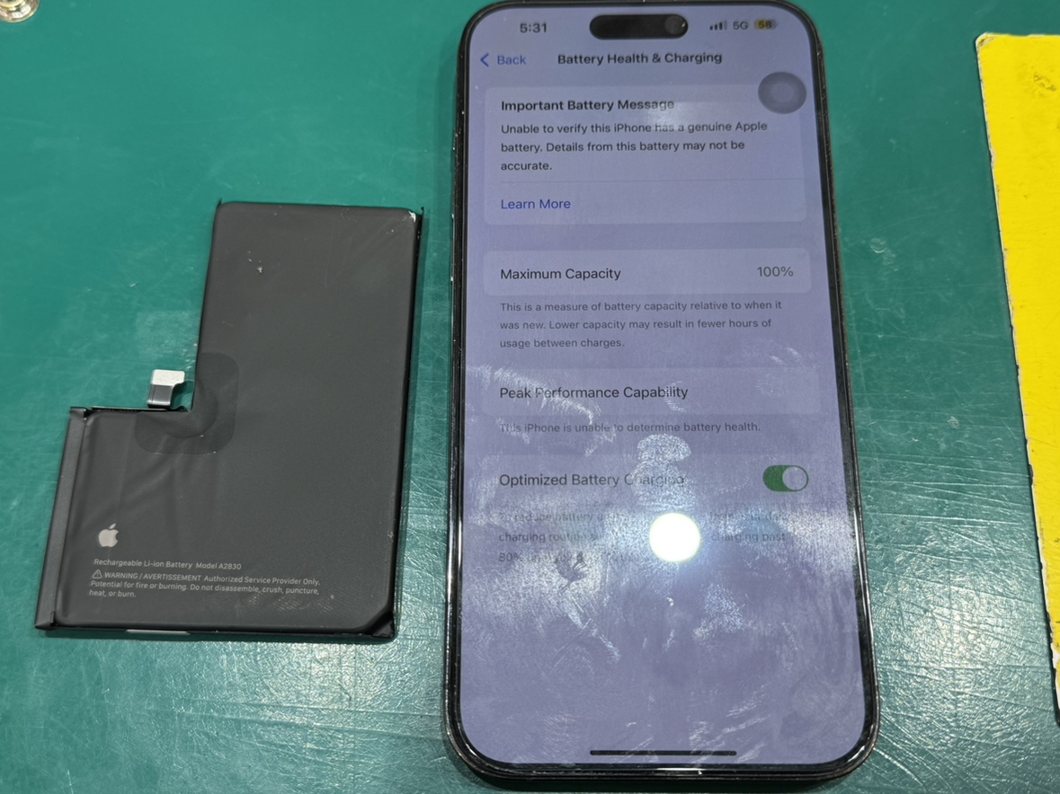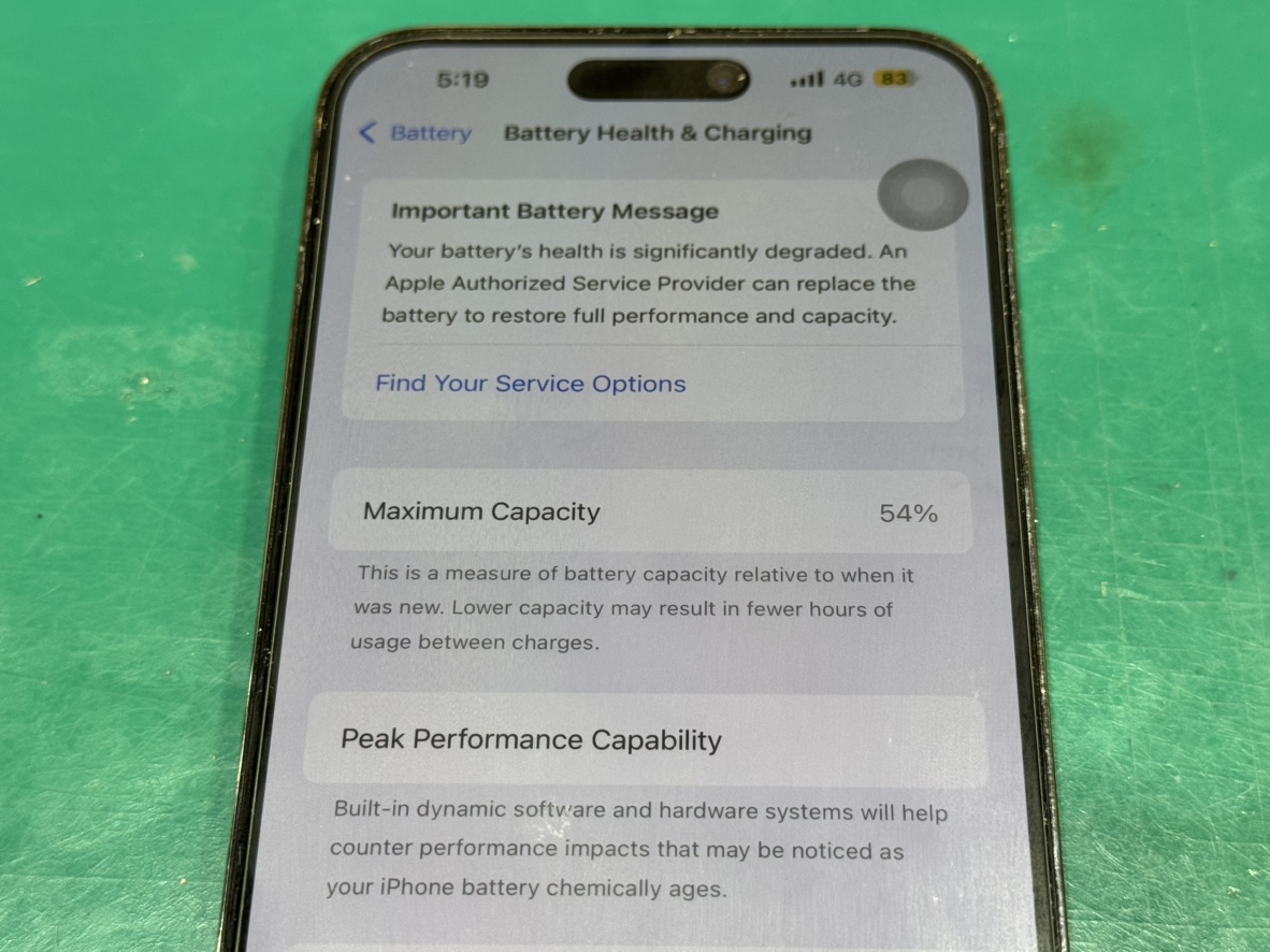 iPhone14ProMaxのバッテリー最大容量54%の劣化でお困りなら、スマホ修理工房 新宿PePe店へ。