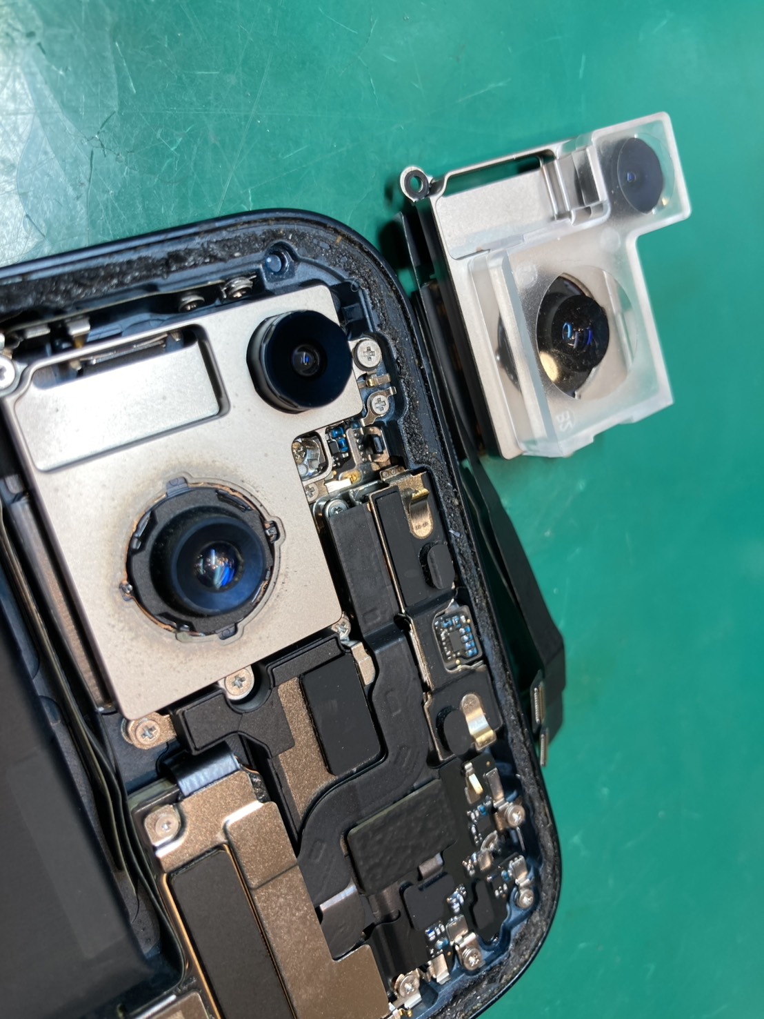 こうなってしまうとガラスの張り直しだけでなくカメラ部品自体の交換が必要になります。