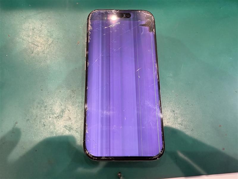 今回修理を行った端末は画面にひび割れがあり液晶も破損している状態の端末となります、、、😢