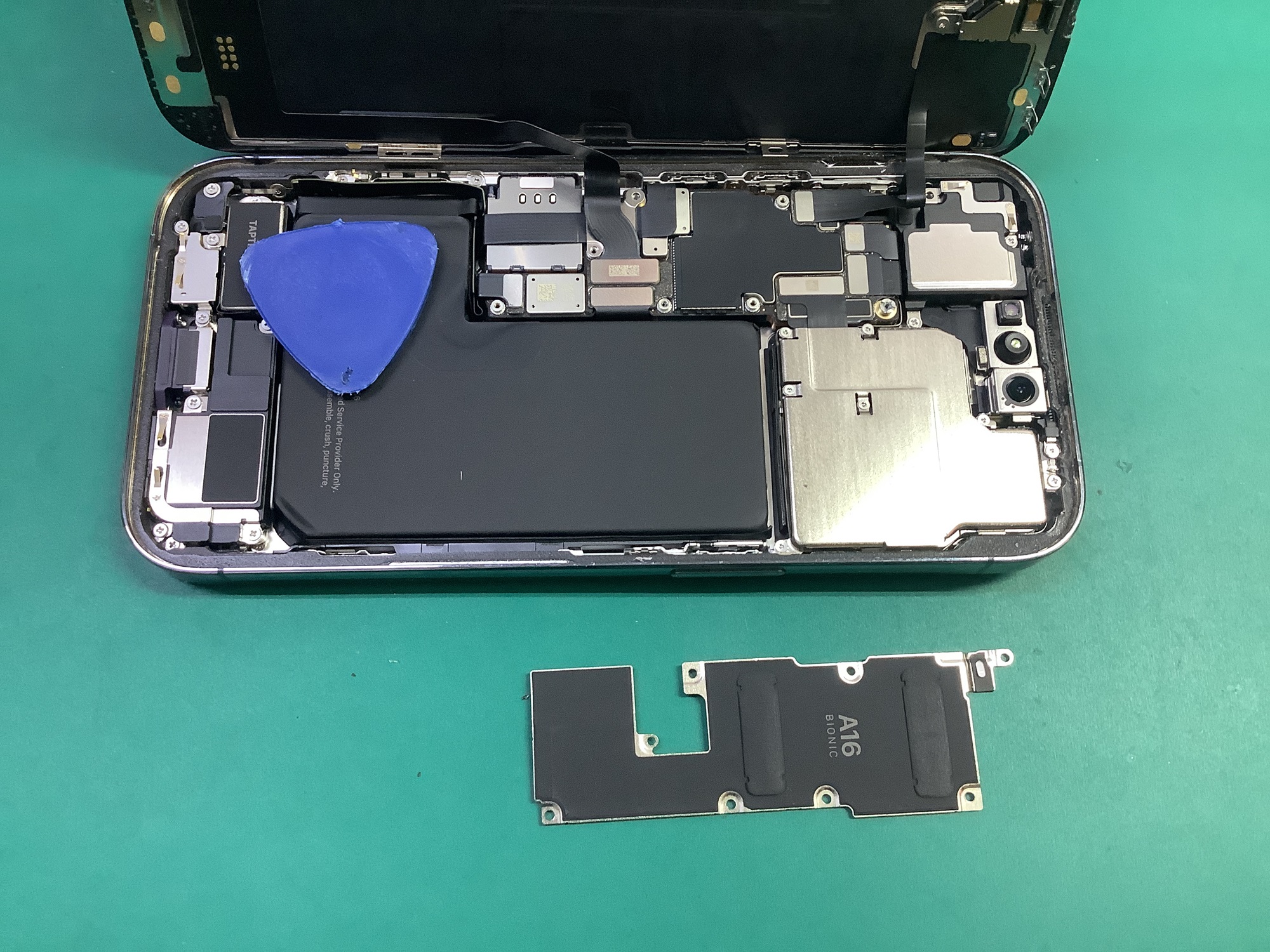 パネルが開きましたので、バッテリー、画面のケーブルを保護しているシールドを外します。