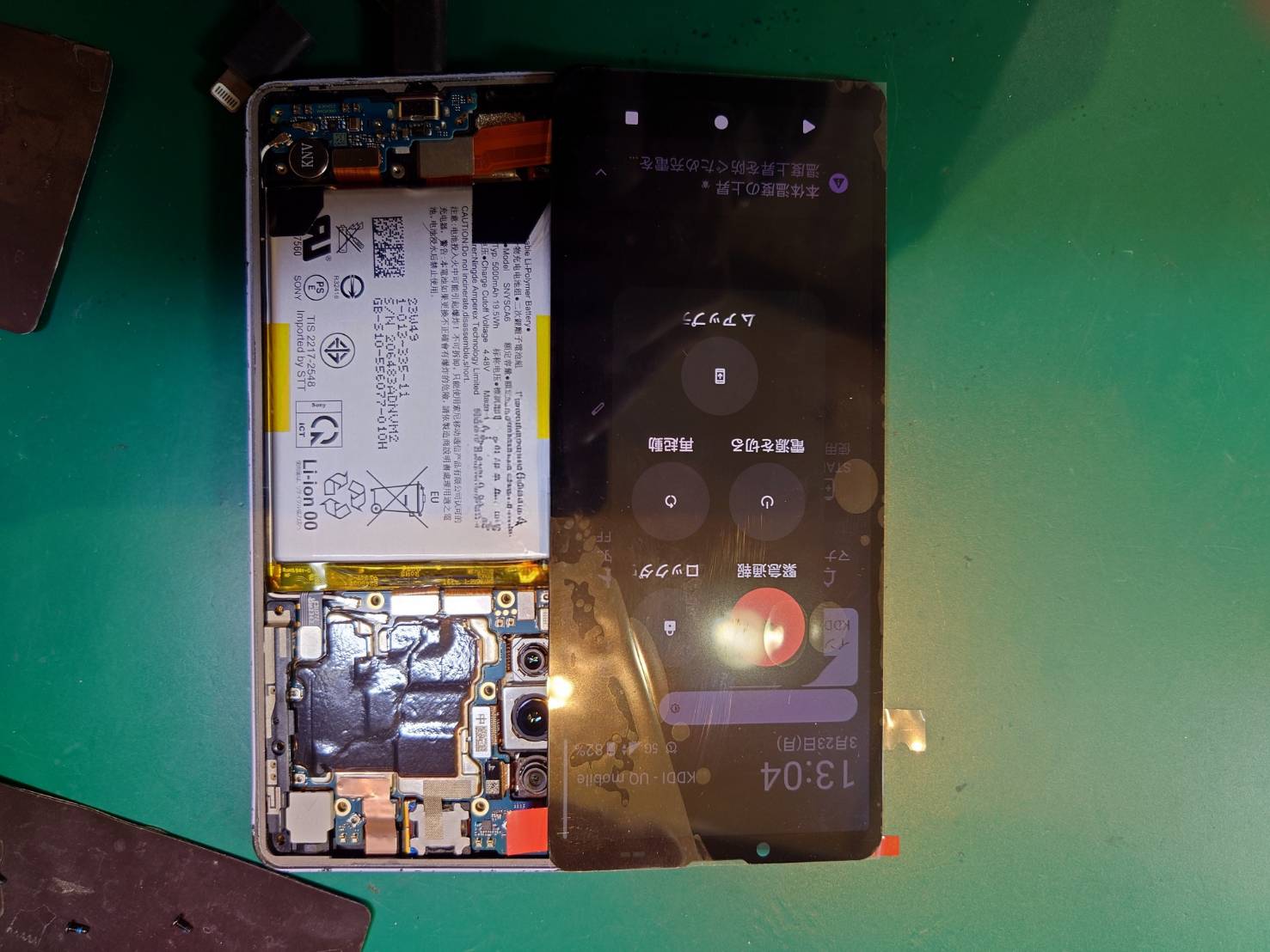割れた画面を外して新しい画面を取り付け、仮組では確認できなかった近接センサーなどが正常に機能することを確認後フレームを清掃して画面を取り付け作業完了です。
