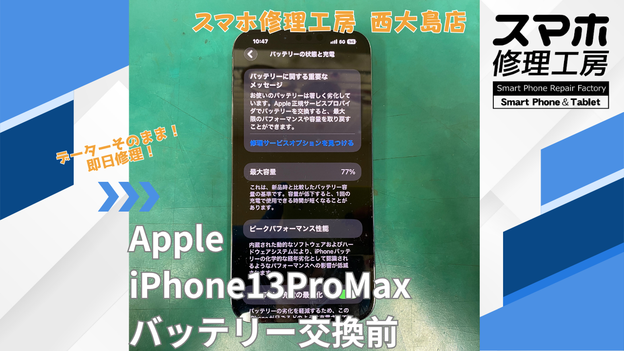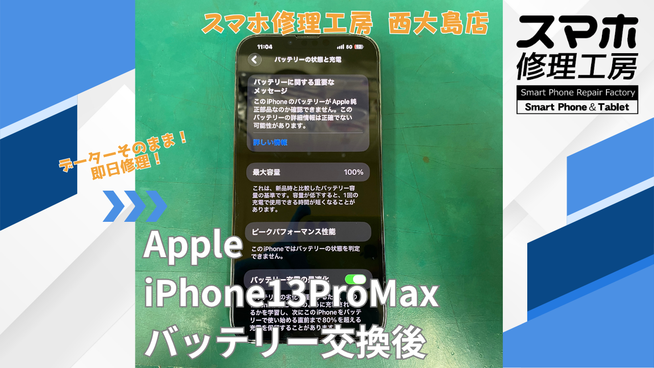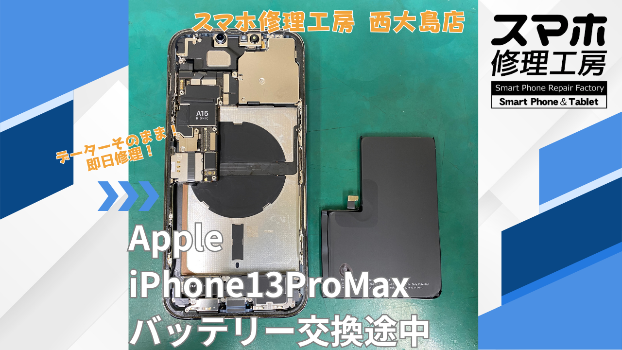 iPhone13ProMax バッテリー交換|江東区でデータそのまま修理ならスマホ修理工房 西大島店