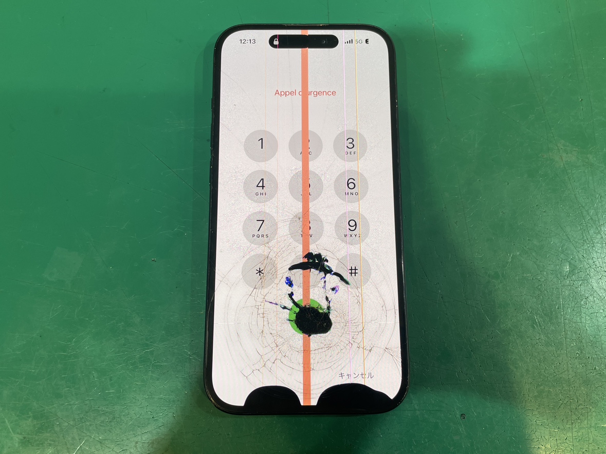 iPhone 15 が落下などの衝撃により、画面のガラス割れと液晶破損が発生。