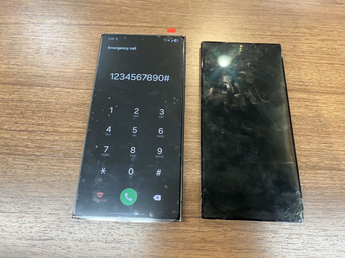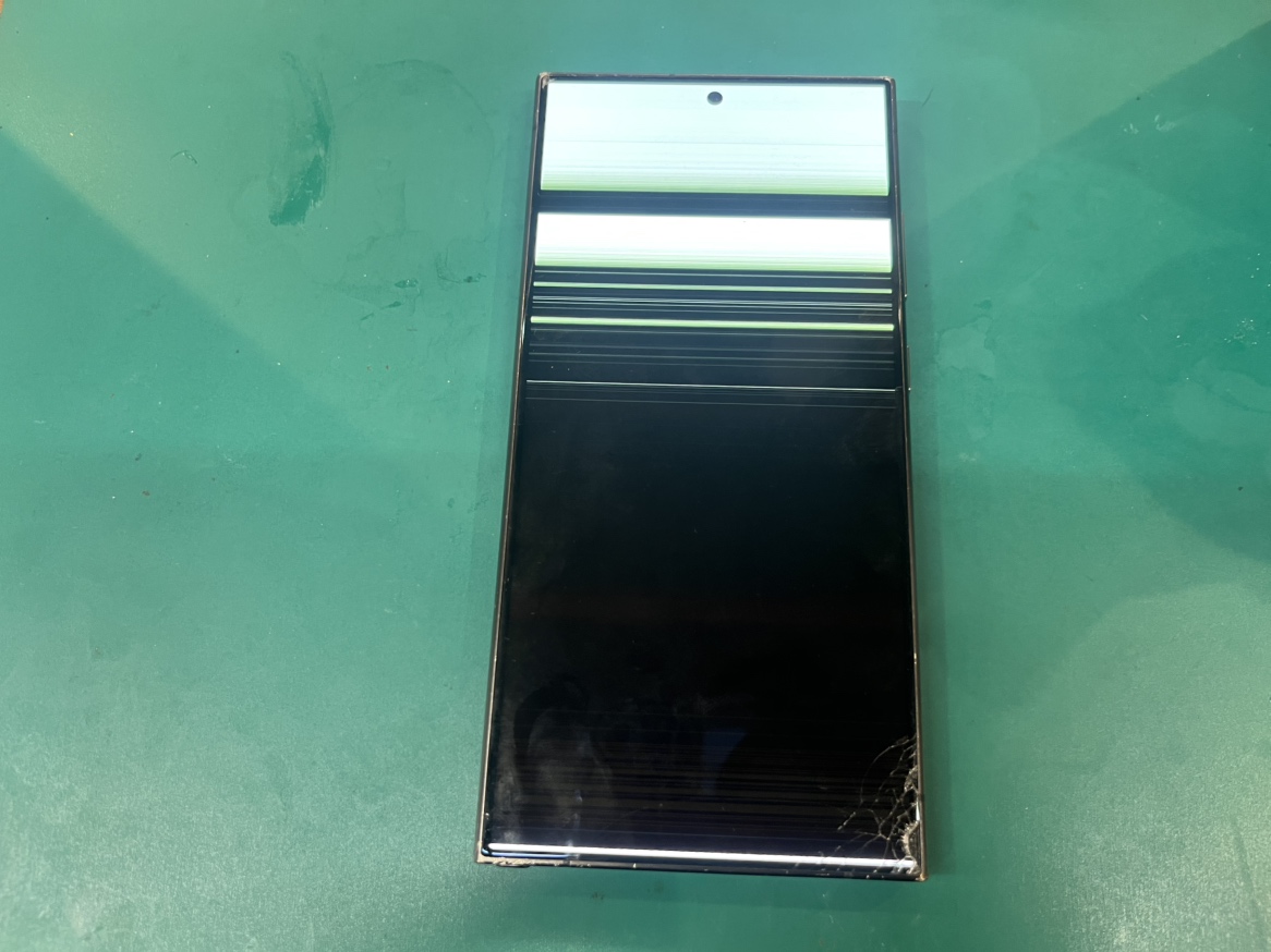 Galaxy S24 Ultraのような最新のハイスペック機種は、画面が映らない状態での放置は誤作動によるデータ消失のリスクもあるため、すぐに新しいディスプレイへの交換修理を実施いたしました。