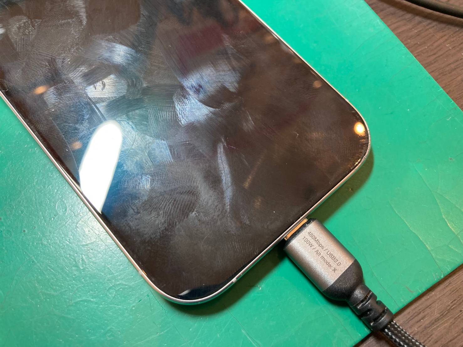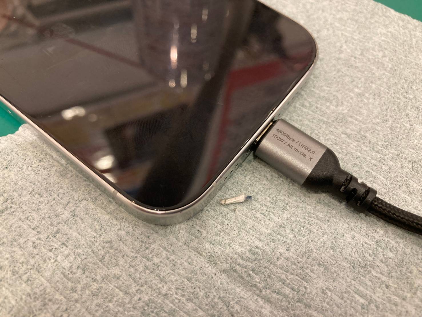 店頭で状態を確認してみたところ、どうやら充電端子に異物が詰まっているようで充電プラグが奥まで刺さらない状態でした。