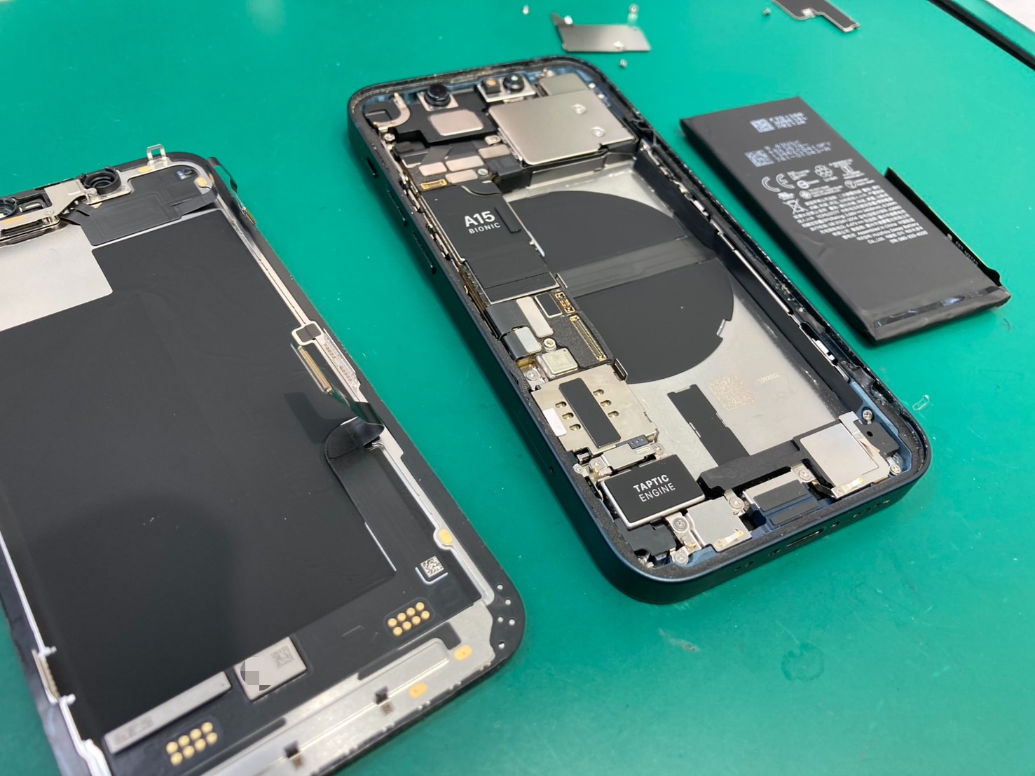 iPhone13miniは画面部品を痛めないよう慎重に取り外し、内部のバッテリーを交換していきます。