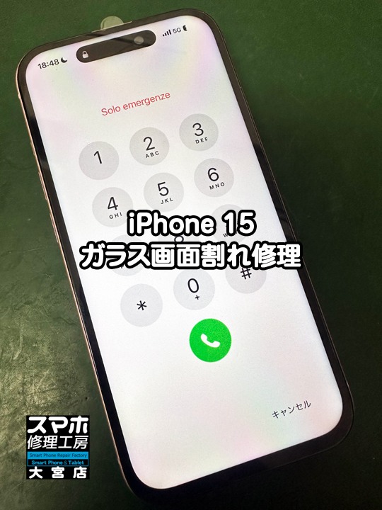 iPhone 15のガラス画面割れ修理です。