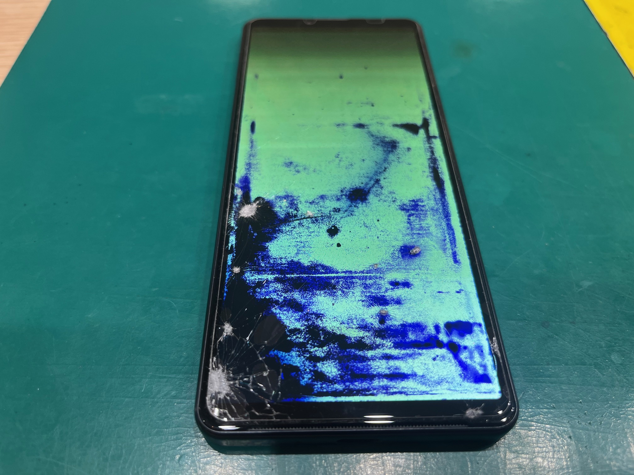 今回ご依頼のXperia 10 Ⅳは、落下の衝撃によりディスプレイが破損し、画面の一部に液漏れが発生している状態でした😨