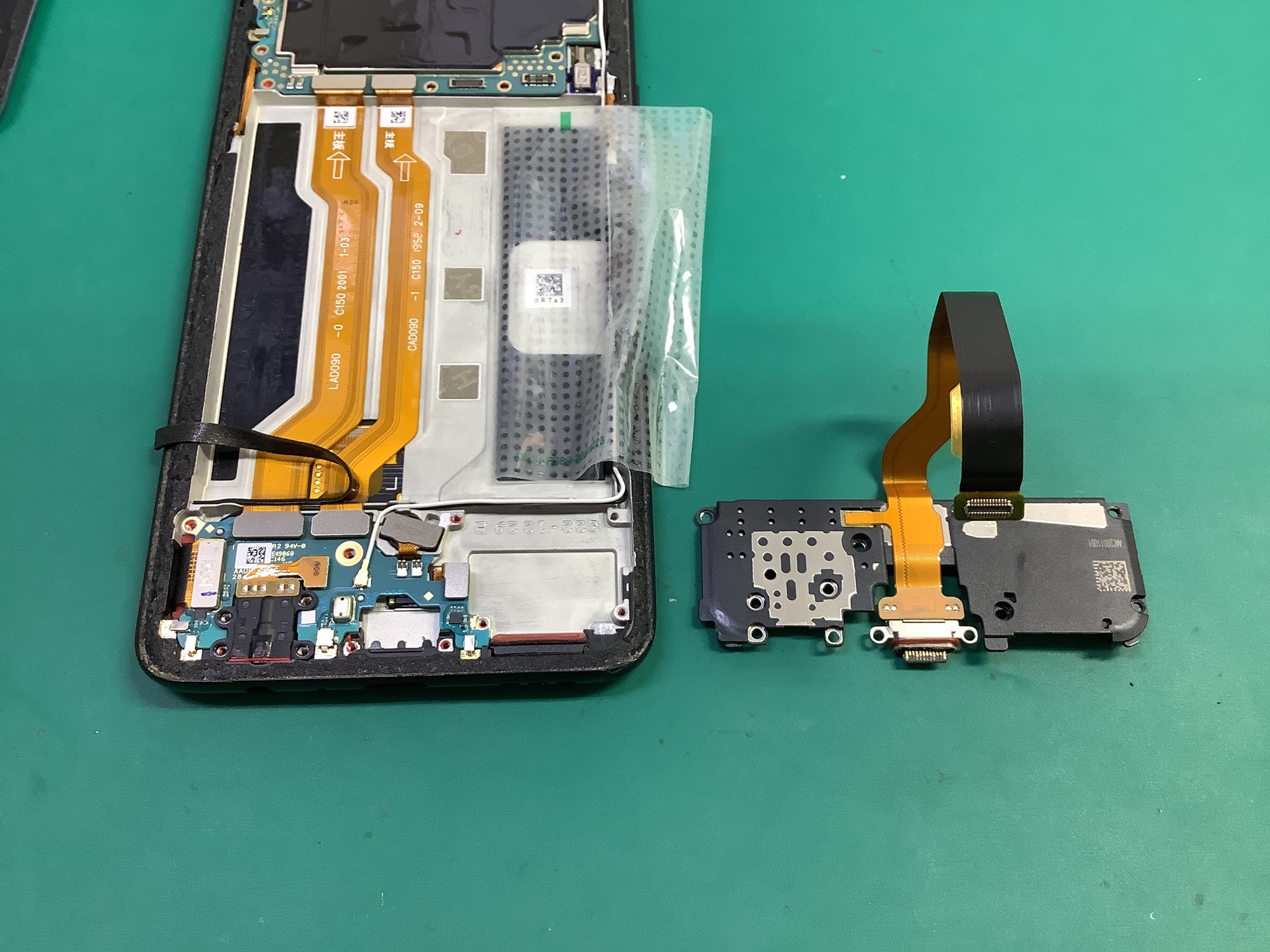 バッテリーが外れましたので、次は下側にあるスピーカー、ドックコネクタ等のパーツを外していきます。