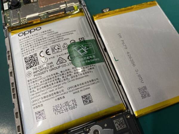 今回お持ち込みいただいたOPPO A73は、バッテリーが膨張して背面が浮いて画面が外れかけている状態でした。