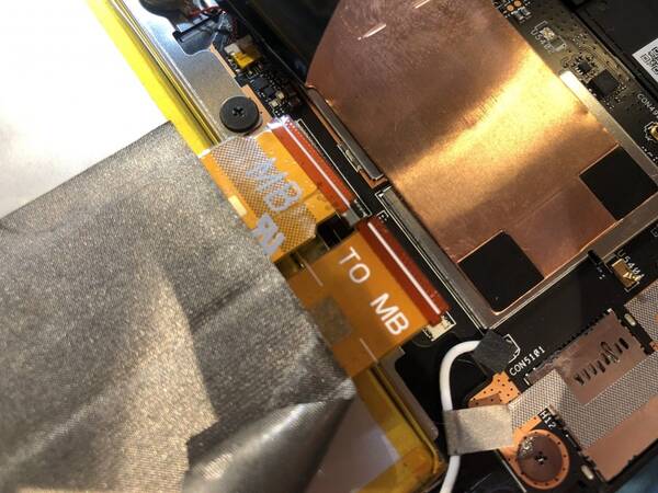 バッテリー上にある本体と液晶を繋ぐケーブル。