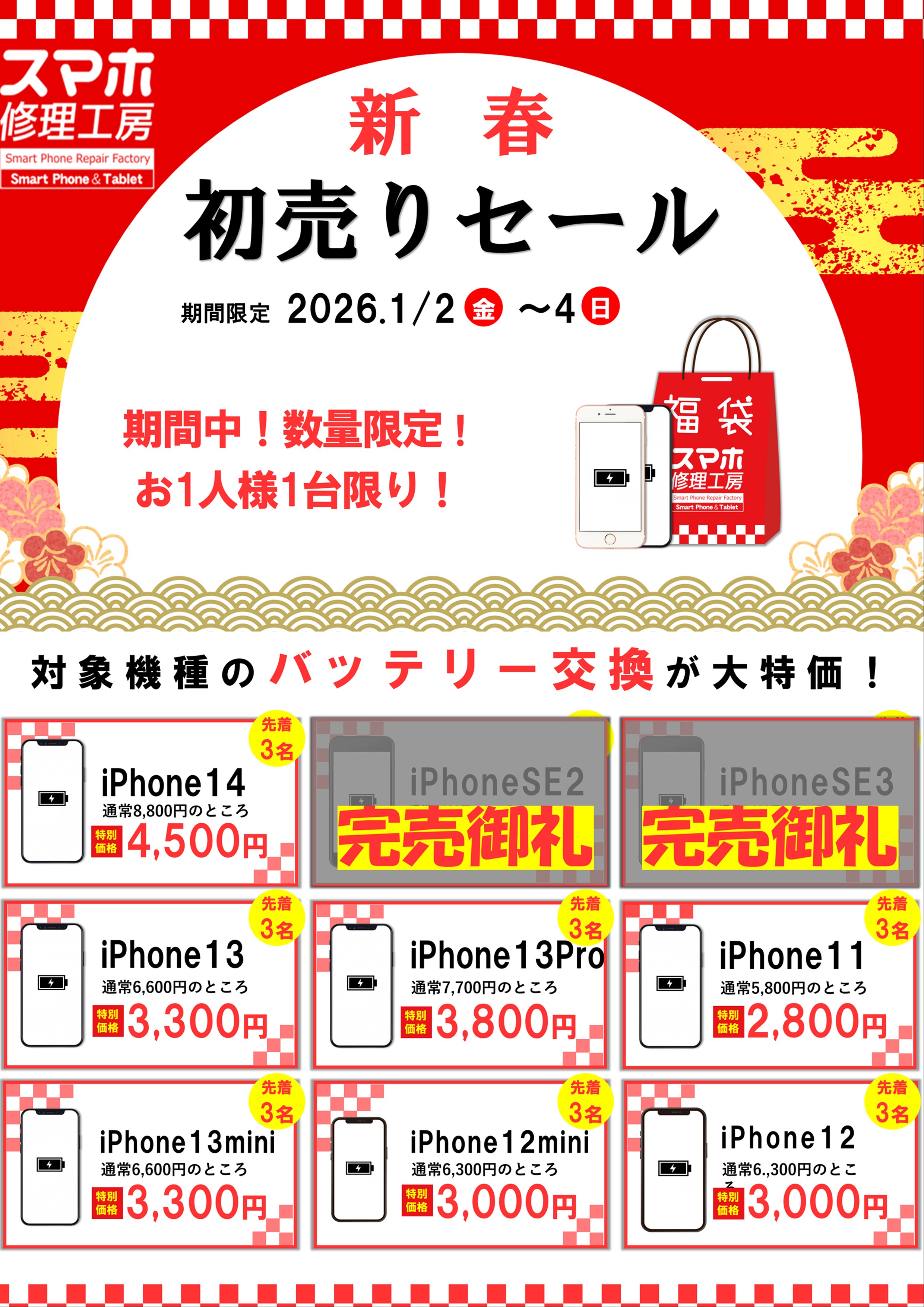 バッテリー劣化が気になる方や、年始のスマホメンテナンスをご検討中のお客様は、ぜひこの機会をご利用ください。