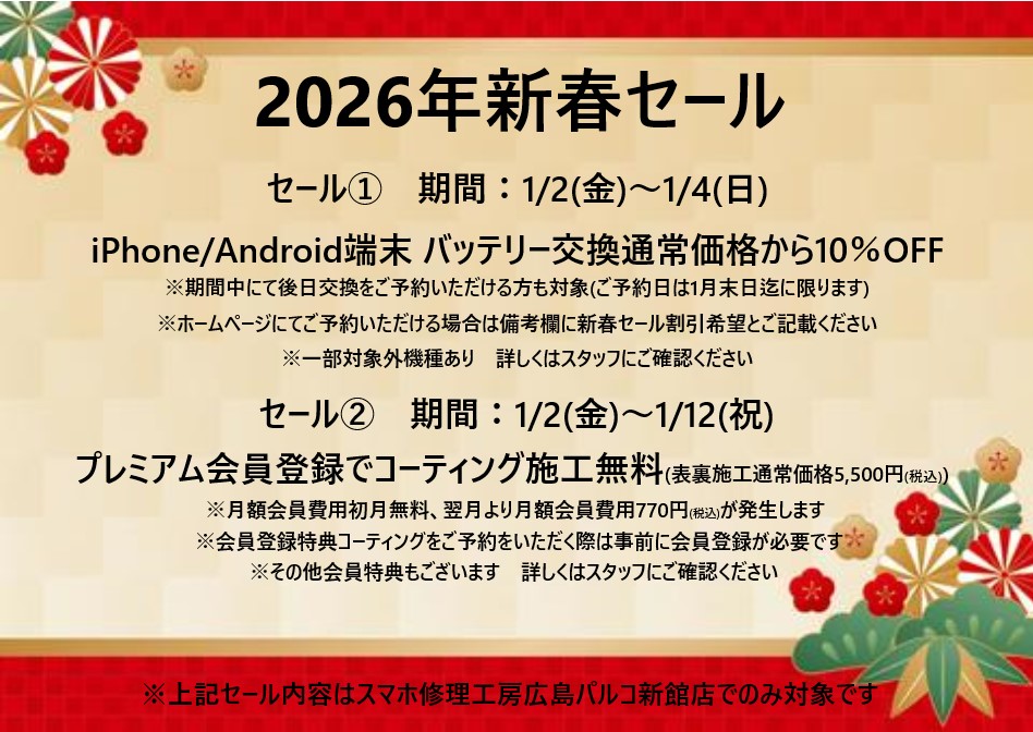 スマホ修理工房広島パルコ新館店にて新春セールを行います。